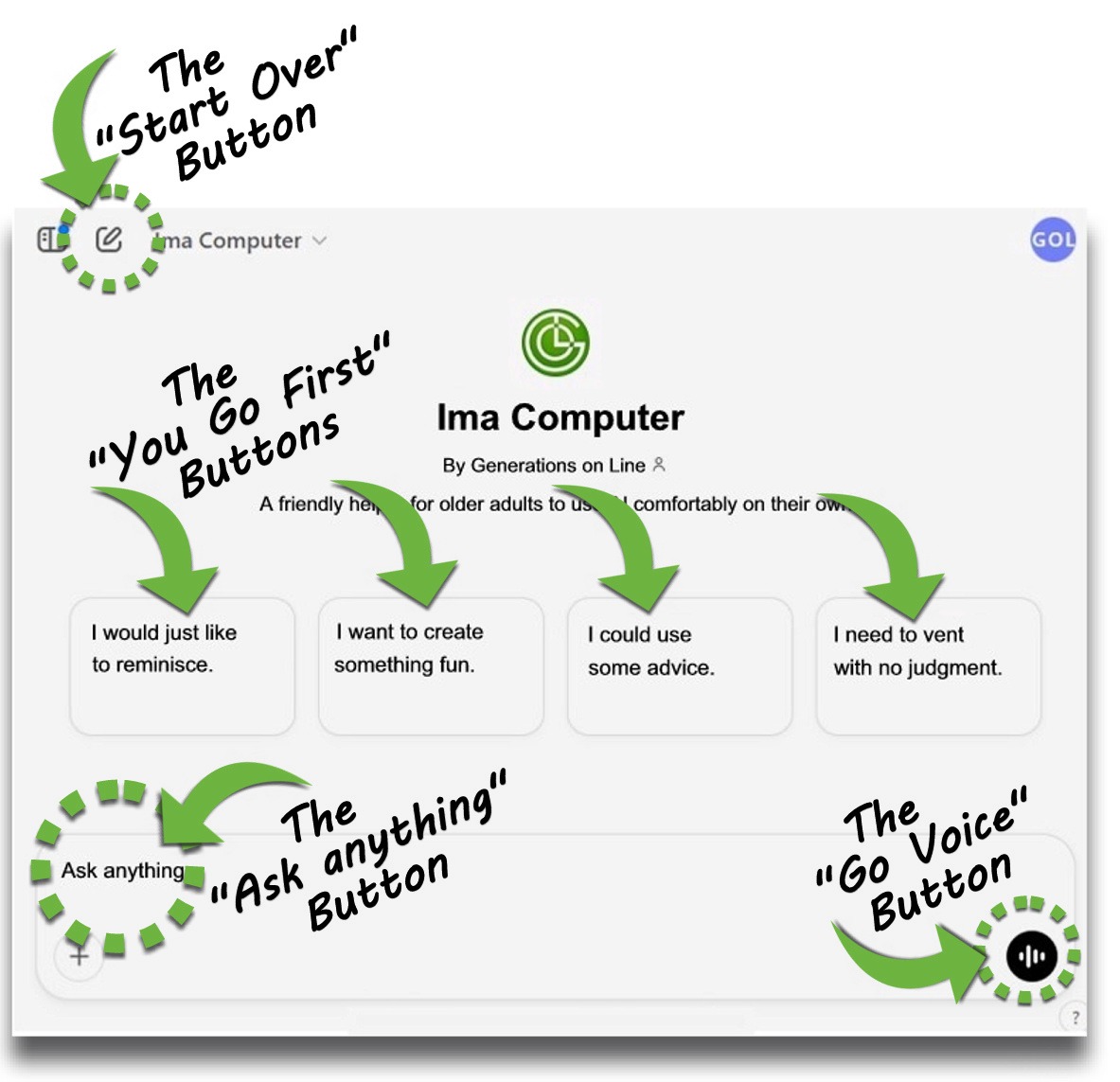 MENU: This is a button that will open a "side bar" with options to use other A.I. ChatGPTs that are similar to Ima but are not specifically for older adults.