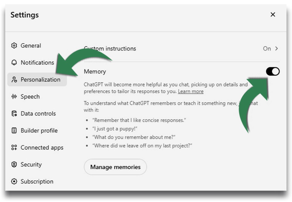 In the settings window, tap on "Personalization" and then tap on the "toggle button" to enable memory, as shown below: